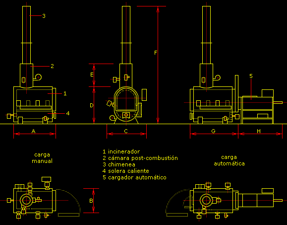 incorpora las siguientes secuencias. 1. Precalentamiento 2. Ciclo encendido 3. Carga automática (cuando existe) 4. Apagado 5. Enfriamiento 6. Extracción de cenizas (si existe el mecanismo automático). El armario de control está acondicionado con el panel de todas las secuencias automáticas, conjuntamente con la indicación de temperatura de cámaras primarias y secundarias (carga automática). En caso de carga manual, sólo indicación de temperatura. |